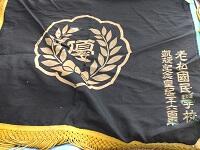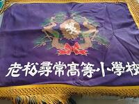 老松小学校の校旗、卒業アルバム、校歌原譜、そして、老松小学校校舎に飾られていた校章などが展示されています。
